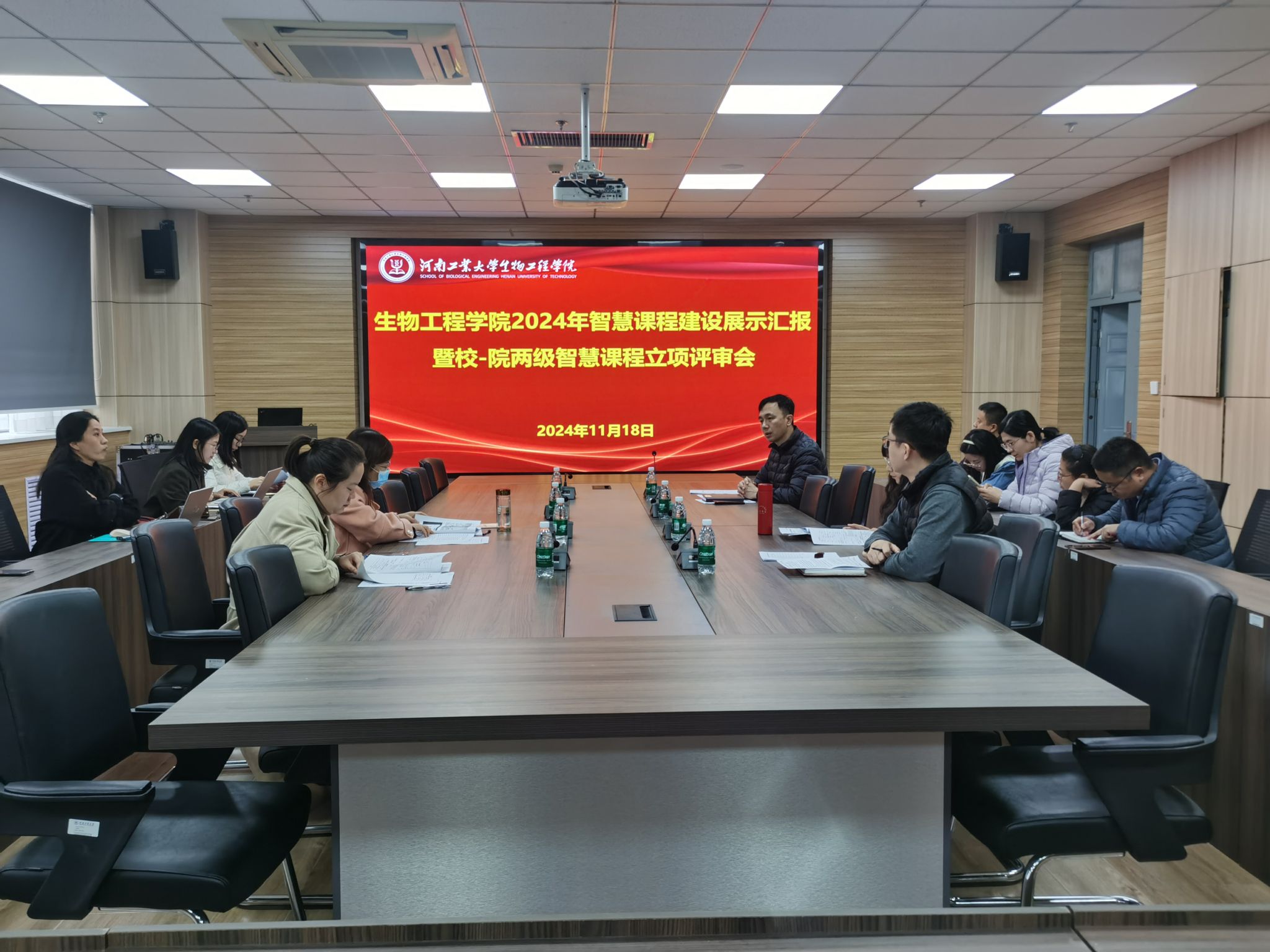 在惟德楼1313会议室召开2024年智慧课程建设展示汇报暨校-院两级智慧课程立项评审工作。各个专业的专业负责人担任评审专家,学院全体教师参与观摩学习。汇报评审会议由教学副院长崔柳青主持。