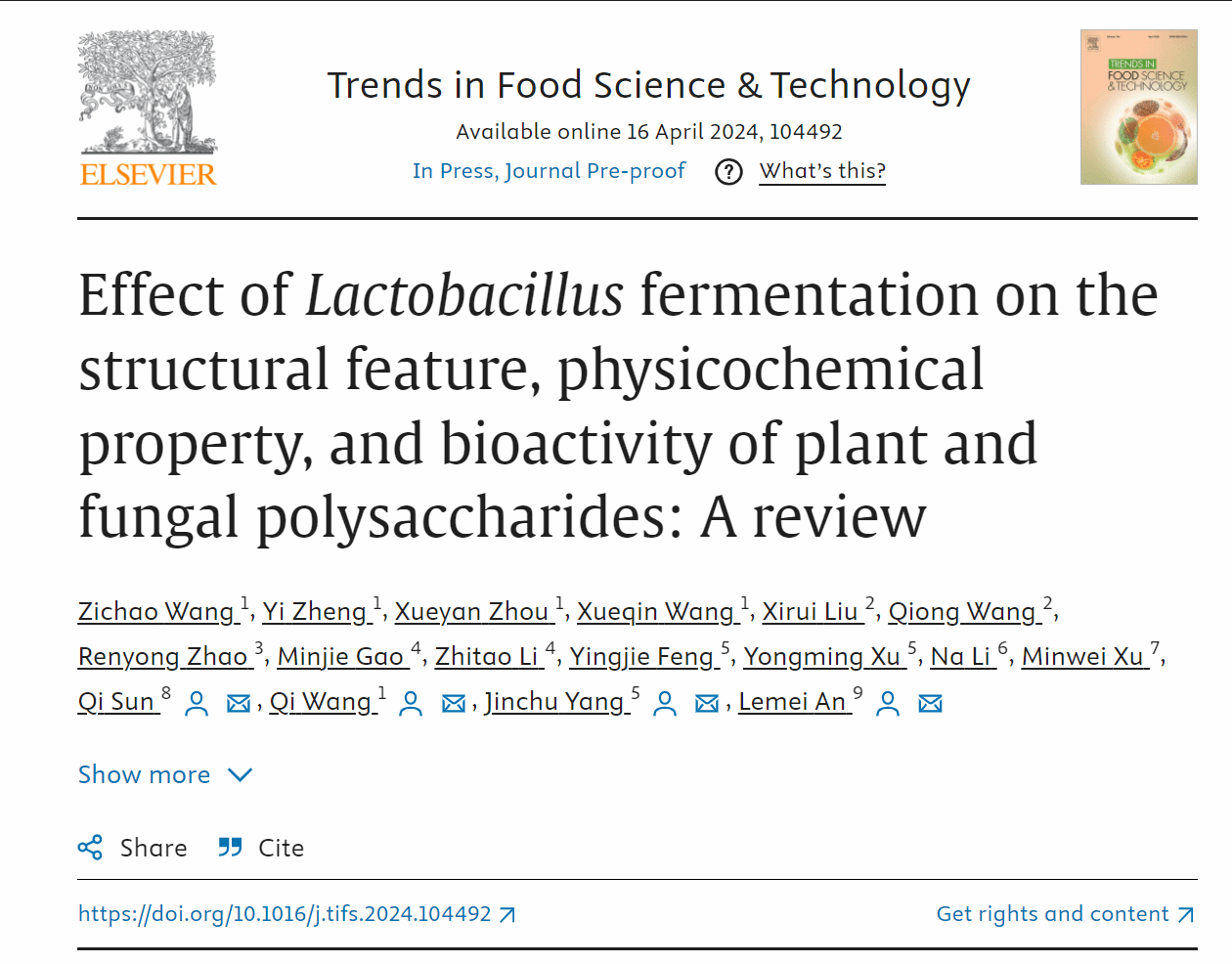 王子朝副教授课题组在食品领域国际顶级期刊Trends in Food Science & Technology(中科院一区,TOP期刊,IF = 15.3)上在线发表了题为:“Effect of Lactobacillus fermentation on the structural feature, physicochemical property, and bioactivity of plant and fungal polysaccharides: A review”的综述论文。该论文全面和系统的综述了近年来乳杆菌发酵对植物和真菌胞外多糖结构特征、理化特性、生物活性的影响。王子朝副教授是第一作者,麻豆tv