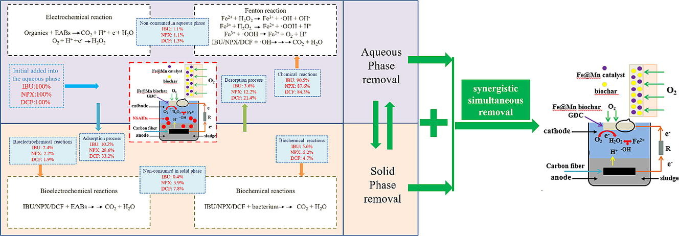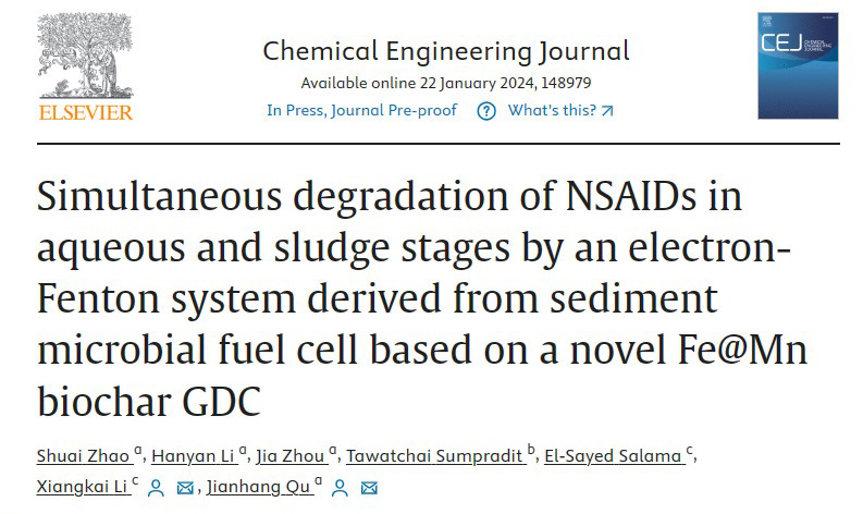 青年教师赵帅博士在国际著名学术期刊Chemical Engineering Journal(影响因子IF=15.1,中科院1区,TOP期刊)发表题为“Simultaneous degradation of NSAIDs in aqueous and sludge stages by an electron-Fenton system derived from sediment microbial fuel cell based on a novel Fe@Mn biochar GDC”的研究论文,报道了利用电活性微生物介导的生物电芬顿体系实现污水和污泥中非甾体抗炎药环境残留同步降解的最新研究成果。我校为论文的第一完成单位和通讯单位,环境微生物技术创新团队青年博士赵帅为第一作者,团队负责人屈建航教授和兰州大学李祥锴教授为共同通讯作者。