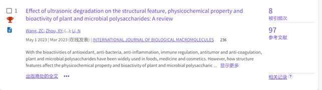 王子朝副教授等于2023年03月发表于功能多糖领域《International Journal of Biological Macromolecules》(中科院一区,TOP期刊,IF=8.2)上的综述论文“Effect of ultrasonic degradation on the structural feature, physicochemical property and bioactivity of plant and microbial polysaccharides: A review”,被ESI数据库遴选为高被引论文。