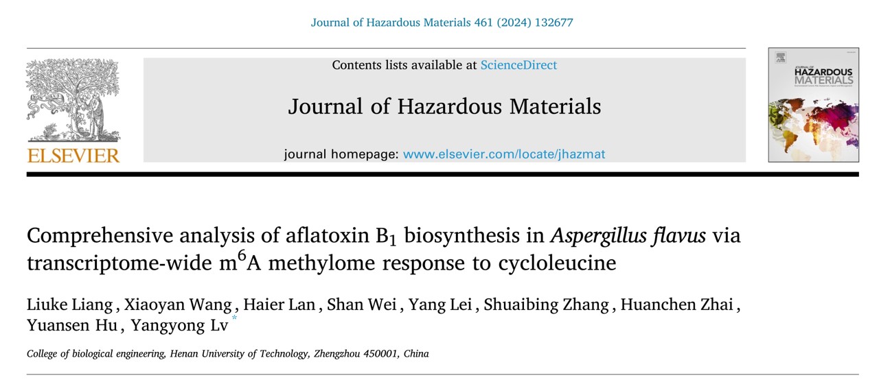 粮油食品微生物危害防控团队吕扬勇课题组在国际顶刊《Journal of Hazardous Materials》(中科院一区TOP,IF=13.6)上发表了题为“Comprehensive analysis of aflatoxin B1biosynthesis inAspergillus flavusvia transcriptome- wide m6A methylome response to cycloleucine”的研究论文。该团队2021级硕士研究生梁柳柯为论文第一作者,吕扬勇为通讯作者,麻豆tv