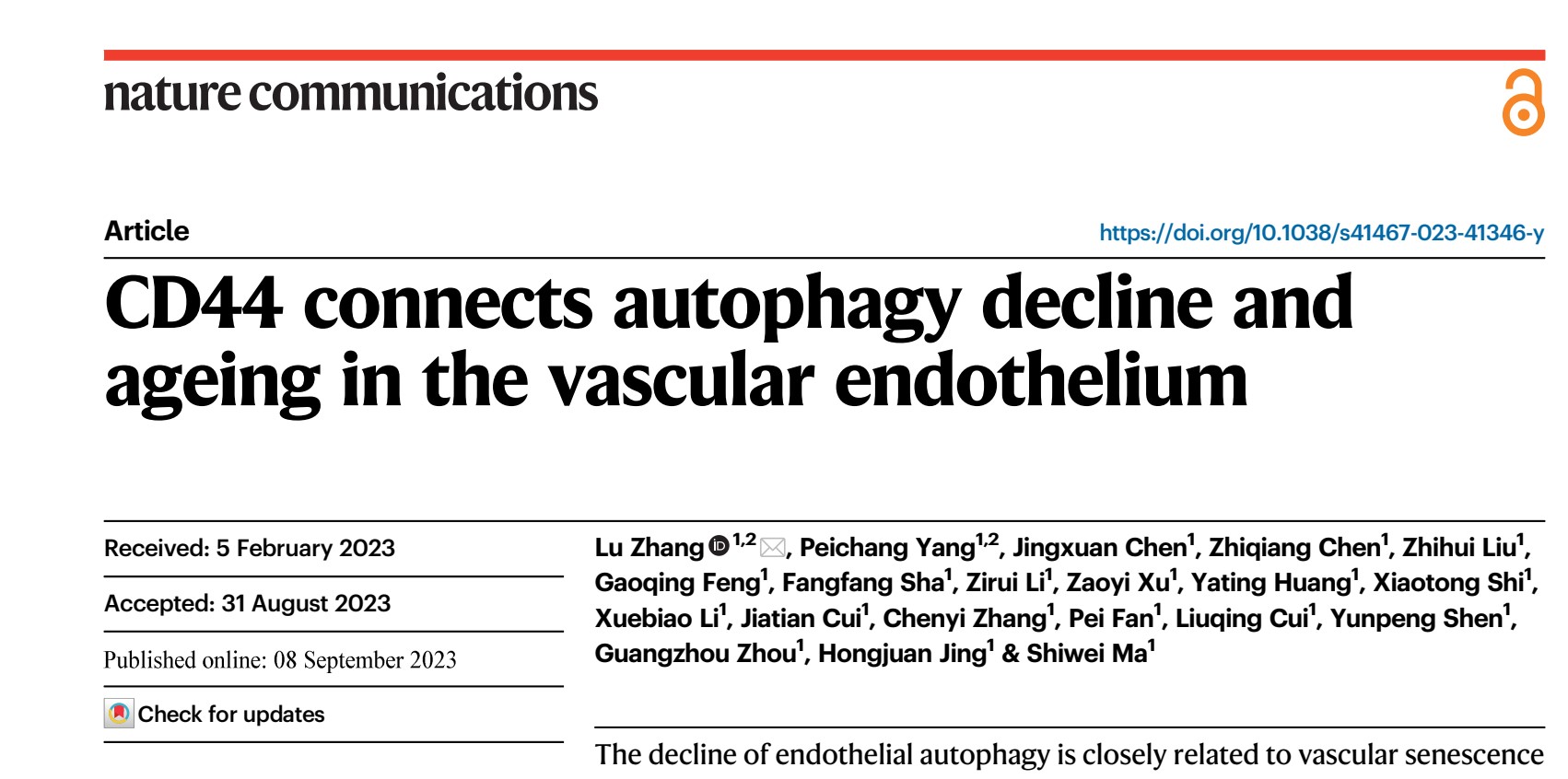 细胞功能调控与化学干预团队张璐教授课题组在Nature子刊Nature Communications上发表题为 “CD44 connects autophagy decline and ageing in the vascular endothelium” 的研究成果(//www.nature.com/articles/s41467-023-41346-y)。该项长达十余年的研究工作详细解析了CD44作为“桥梁分子”关联自噬减退、血管衰老及寿命的功能。张璐教授和2020级硕士研究生杨培长为论文的共同第一作者,张璐教授为通讯作者,麻豆tv