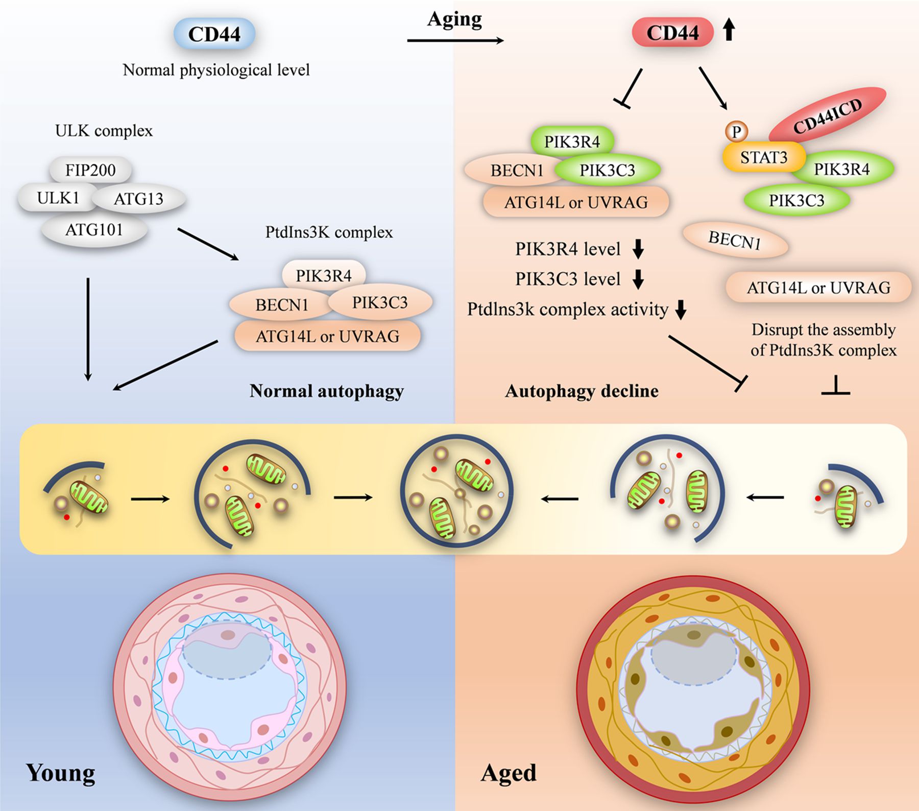 自噬减退被认定为机体衰老的标志之一。血管内皮细胞持续暴露于循环的血液中,易受各种危险因素攻击,特别容易老化受损。然而,引发血管内皮细胞自噬减退的核心分子事件远未搞清,导致临床上缺乏潜在的干预靶点。该项研究发现,多功能黏附分子CD44伴随增龄积累在血管内皮细胞中,通过其胞内结构域(CD44ICD)和STAT3互作,阻碍自噬核心PtdIns3K 复合物的装配以及活性,抑制自噬。利用CRISPR基因编辑技术敲除CD44能够改善血管内皮细胞衰老表型;反之,在小鼠血管内皮细胞特异性敲入CD44ICD直接导致动物“丧失青春”,甚至显著缩短寿命。激活自噬能够逆转CD44ICD引发的早衰。进一步研究发现CD44调节自噬、衰老以及寿命的功能在秀丽隐杆线虫中高度保守。心脑血管疾病是我国居民致残、致死的首要病因。血管老化是机体衰老的标志性特征,也是引发血管病变的“罪魁祸首”。该研究成果为延缓血管衰老、改善机体健康提供了新策略和新靶点。