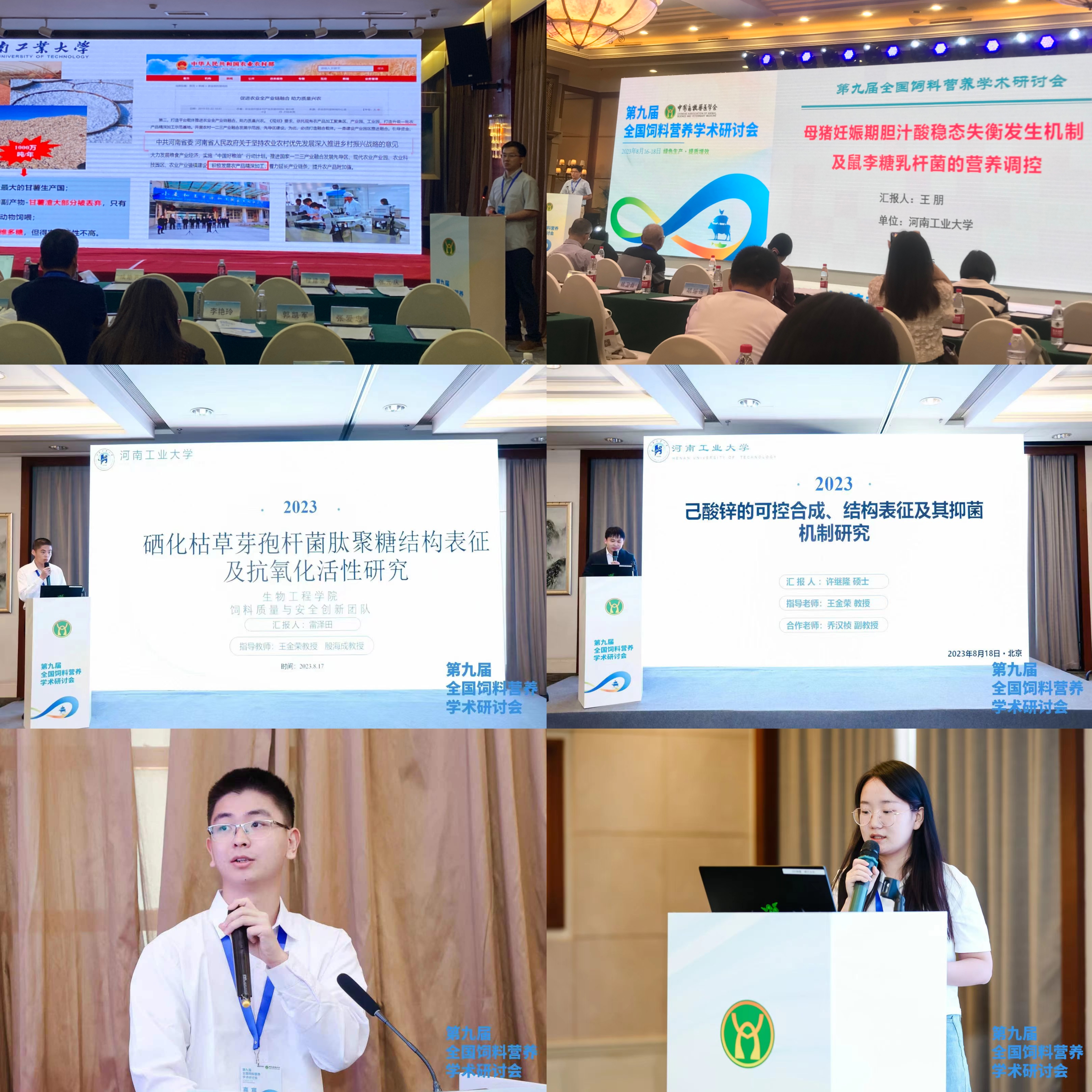 此次研讨会共设5个专题分会场:1、猪营养,2、反刍动物营养,3、家禽营养,4、饲料原料与饲料添加剂,5、饲料生物技术与安全/水产、特种动物/其他。来自全国相关领域专家、学者、技术权威及行业代表,就当前饲料科学与动物营养领域的热点和前沿问题做专题报告、讲座;开展饲料科学、动物营养及相关交叉学科的交流与研讨;聚焦我国目前养殖形势和产业实际,重点开展畜禽养殖“减抗、替抗、禁抗”背景下,新型饲料原料、饲料添加剂产业前沿科技成果及新产品信息交流。大会共有4个专题报告和47个分会场特邀报告,以及136个分组学术交流汇报和77篇壁报展示。我院动物科学系教师乔汉桢副教授和王朋博士分别作了题为“挤压膨化辅助提取甘薯渣多糖及其特性研究”及“母猪妊娠期胆汁酸稳态失衡机制研究及鼠李糖乳杆菌的营养调控”的分会场报告。4名硕士研究生雷泽田、许继隆、丑义宣和李梦琦在分会场进行了学术交流,题目分别为“硒化枯草芽孢杆菌肽聚糖结构表征及抗氧化活性研究”、“己酸锌的可控合成、结构表征及其抑菌机制研究”、“不同脱色工艺地黄多糖物化、结构和抗氧化特性研究”和“月桂酸锌对ETEC感染小鼠肠道损伤的影响及机制研究”。郭琳娜博士和硕士研究生陈倩倩的论文进行了壁报展示。此外,王金荣教授还担任了“饲料原料与饲料添加剂”分会场的主持工作。