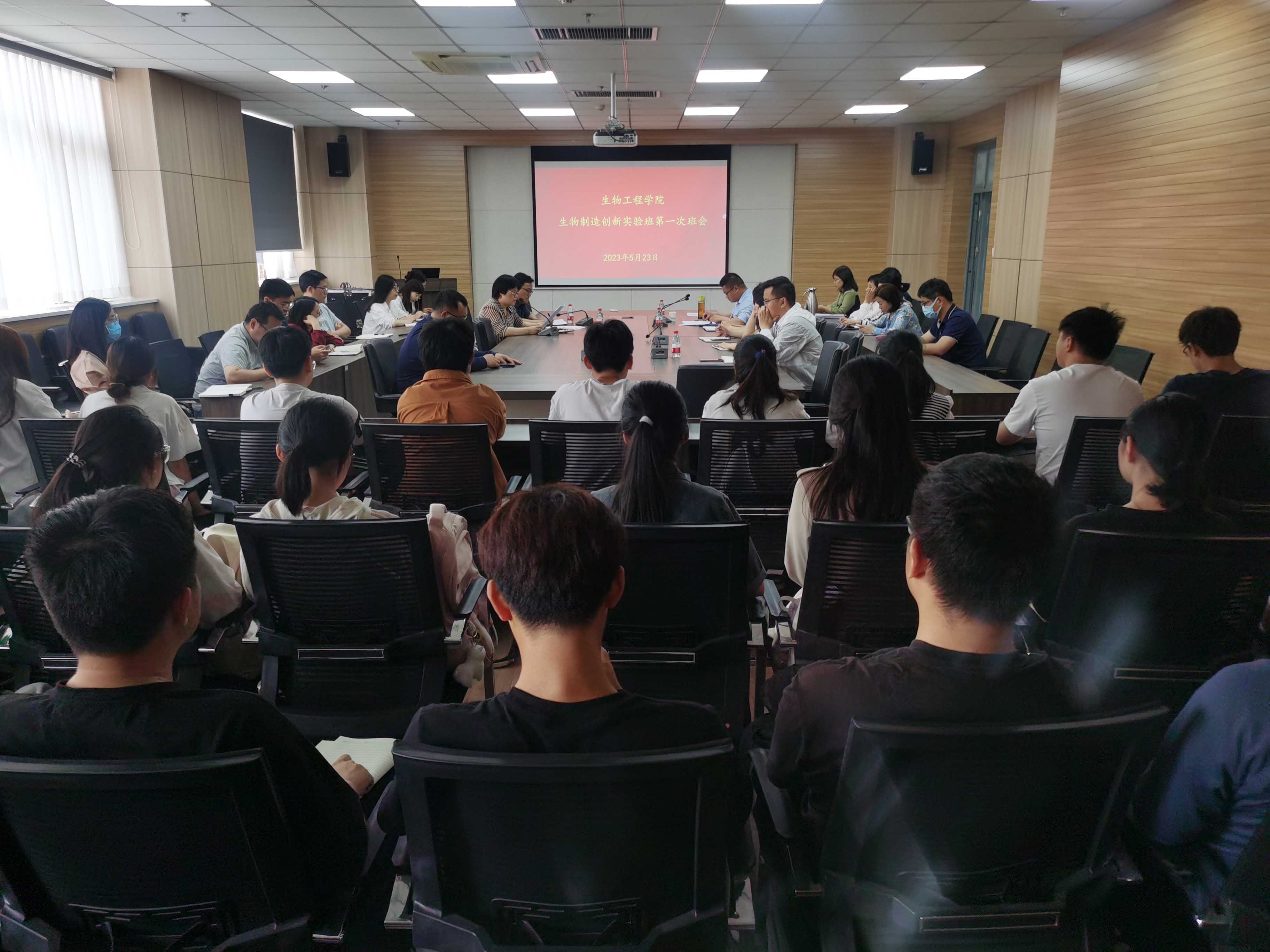 以河南省重点科学“生物学”和省部级实验室平台为依托,在生物工程、制药工程、生物技术和饲料工程专业一年级学生中选拔组建科教协同类生物制造创新实验班。2023年5月23日下午在1313会议室,学院召开了生物制造创新实验班第一次班会。学院党委副书记余汉华、教学办、学工办、创新实验班全体学生和导师参加了会议。会议由副院长屈建航主持。