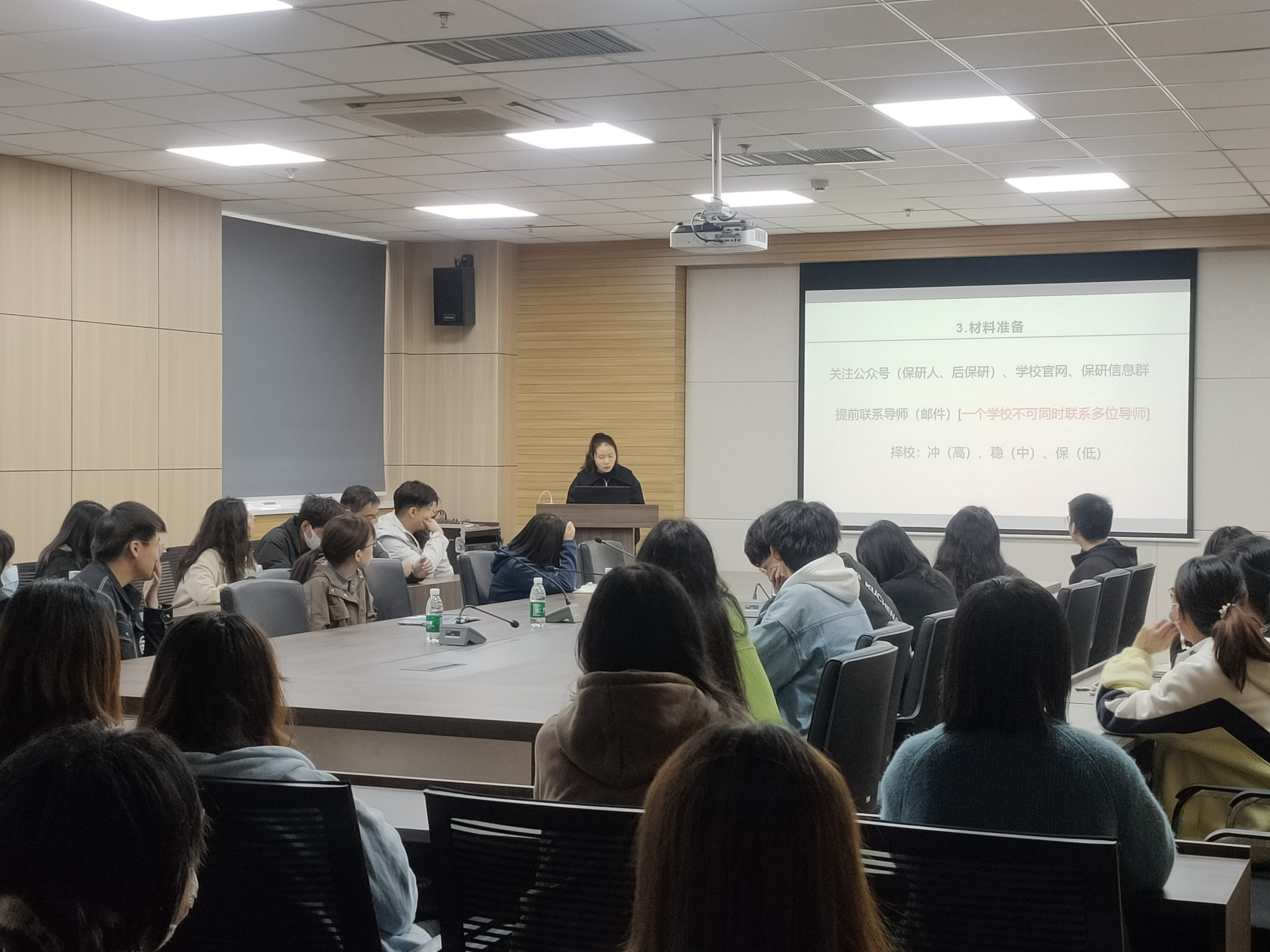 岳媛媛结合我院近几年学生的考研报名和录取情况,重点从心态调整、专业课复习、院校报考三个方面向同学们进行了详细讲解和指导。她鼓励同学们:一要调整好心态,合理安排复习时间、做好复习规划;二要认真做好专业课复习、吃透专业知识,形成系统的专业知识体系;三要谨慎报考,做到量体裁衣、不要盲目追求名校,要选择适合自己的学校。