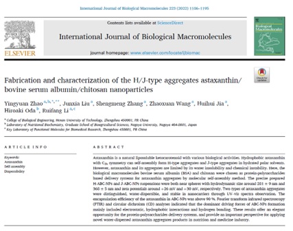 以来,围绕基于多糖-蛋白质构建纳米营养载体递送体系及生物活性小分子如虾青素的营养生化学评价展开研究,2019年获得国家自然基金委青年基金项目支持,2021年获得国家留学基金委公派访学项目资助赴名古屋大学进行博士后/客员研究员研究。近三年来,以第一作者发表中英文学术论文十余篇,其中中科院1区TOP期刊1篇(IF 8.025),题目为“Fabrication and characterization of the H/J-type aggregates astaxanthin/bovine serum albumin/chitosan nanoparticles”(//doi.org/10.1016/j.ijbiomac.2022.11.006),中文核心5篇,其第二作者均为我院2017-2019级本科生,并指导学生获得全国大学生生命科学竞赛国家级一等奖两次,参加具有近百年历史的国际学术生化营养学领域会议2次。担任国家自然科学基金评审专家,并为多个营养生化学领域期刊审稿人。(文/赵英源审核/胡元森)