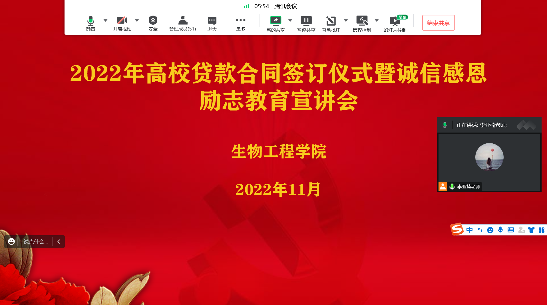 通过腾讯会议召开了2022年高校贷款合同签订仪式暨诚信感恩励志教育宣讲会。学院资助负责人李亚楠、资助助理及申请高校贷款的同学参加了本次线上会议。