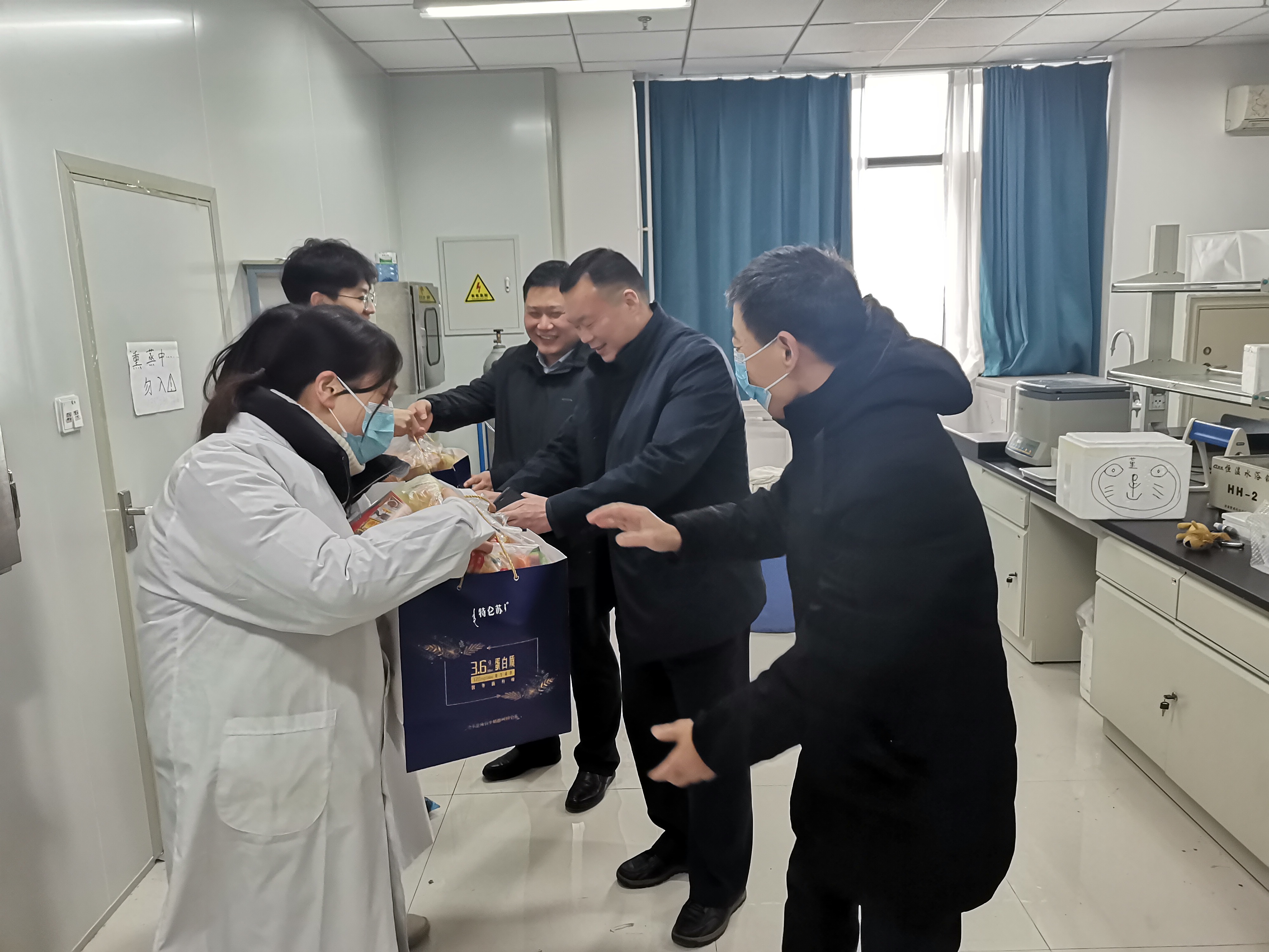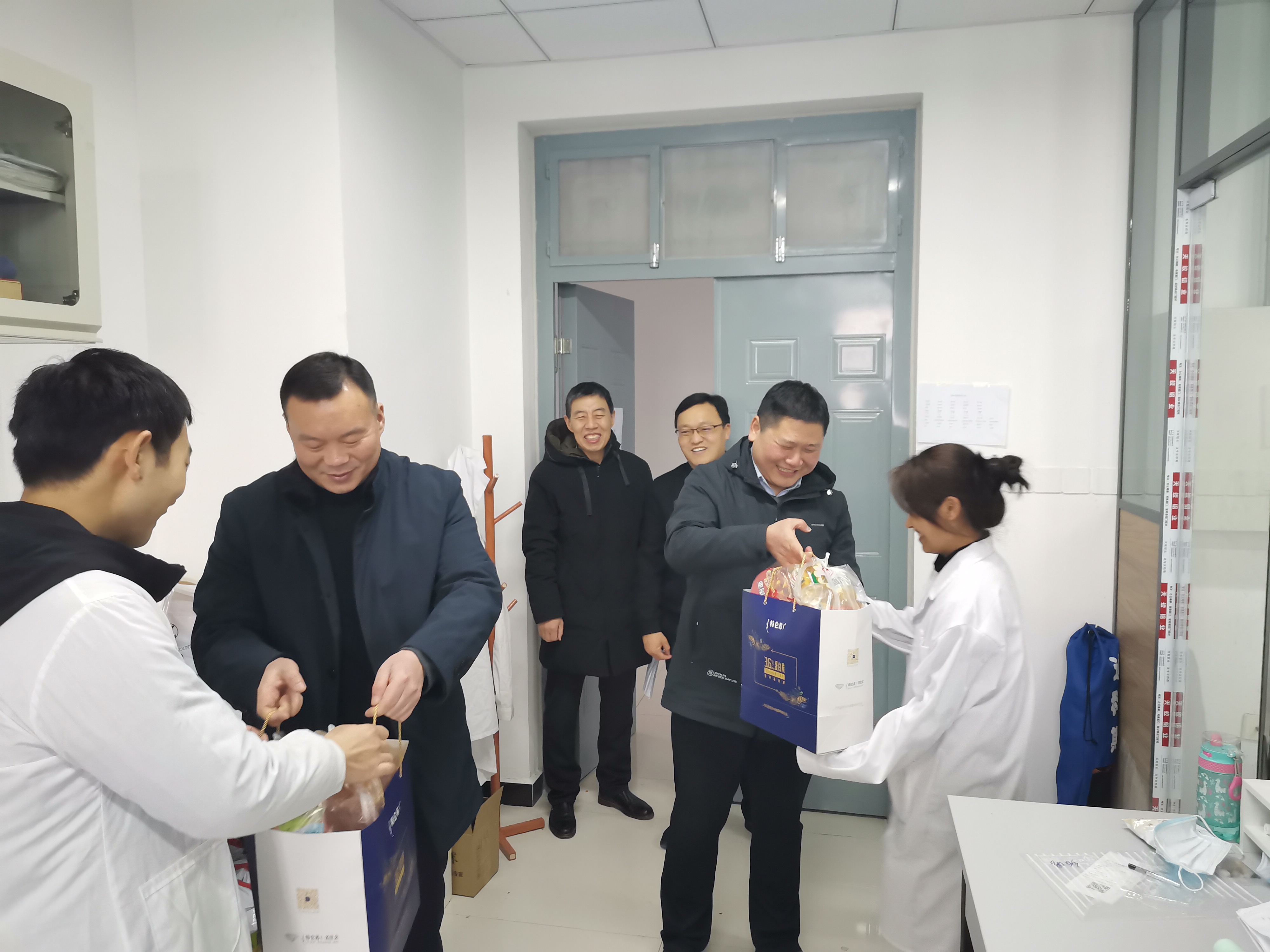 留校研究生同学们对学院领导的关心慰问表示非常感谢,表示这是一个特殊而令人难忘的春节假期,寒假以来学院领导老师多次来实验室巡查看望大家,对同学们非常关心,今天更是收到了学院领导专程送来的满满的爱心礼物和祝福,心里特别温暖。并表示一定服从学校防控部署要求,严格遵守实验室安全管理规程和制度,合理安排好学习科研工作,争取多出成果,努力为学院事业发展作出贡献!