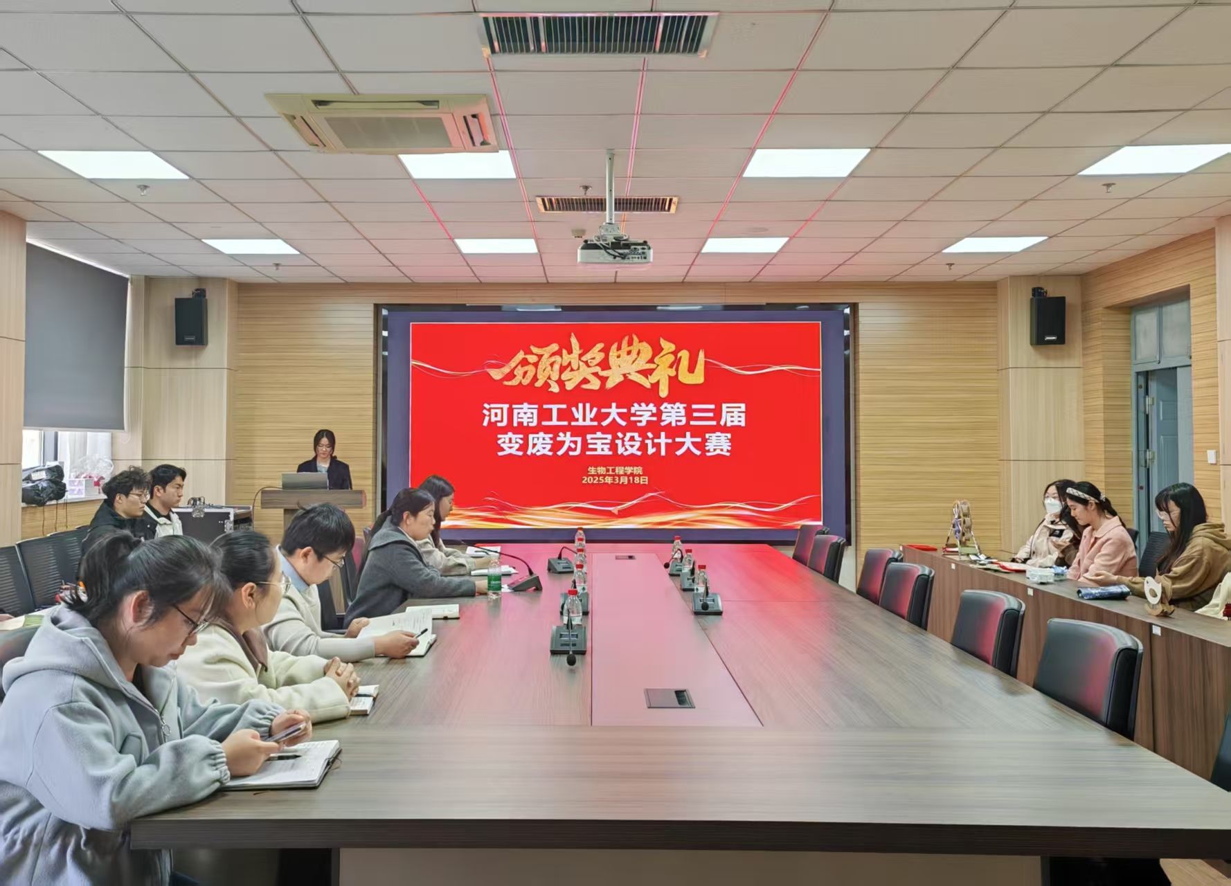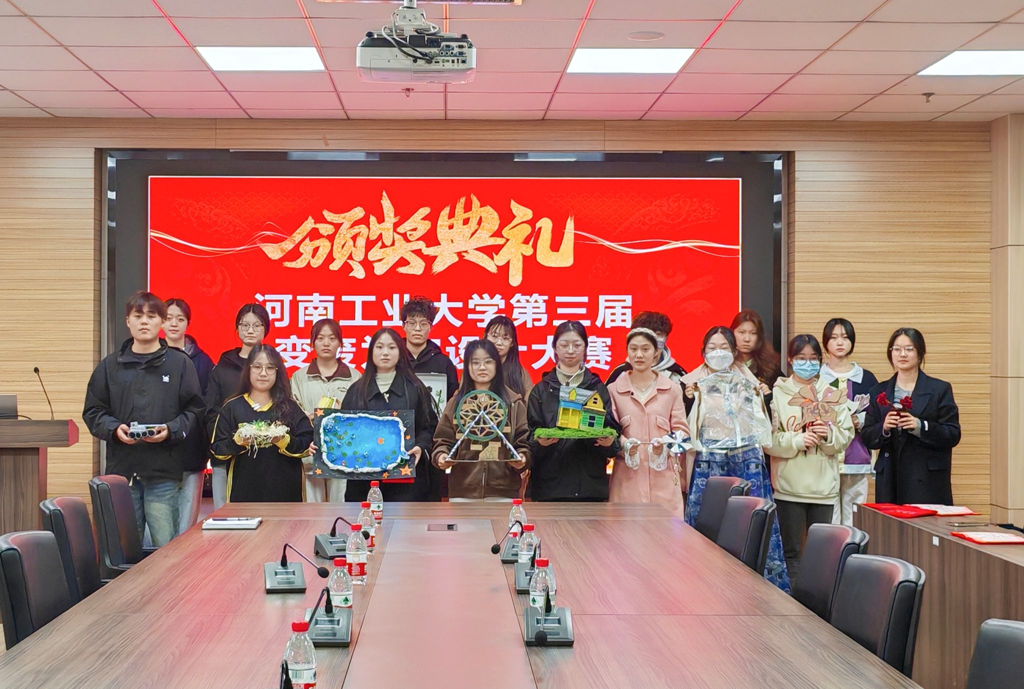 颁奖活动现场,来自于设计艺术学院的获奖学生代表赵婉贞分享了她的创作思路和收获感受。蔡永平代表学院对获奖同学表示祝贺,希望大家以此次比赛为起点,将环保理念融入生活日常,用创新思维解决现实问题,让“变废为宝”成为行动自觉,让青春在“双碳”目标的实践中绽放绚丽光彩!与会领导老师为获奖团队颁发了荣誉证书及奖品。