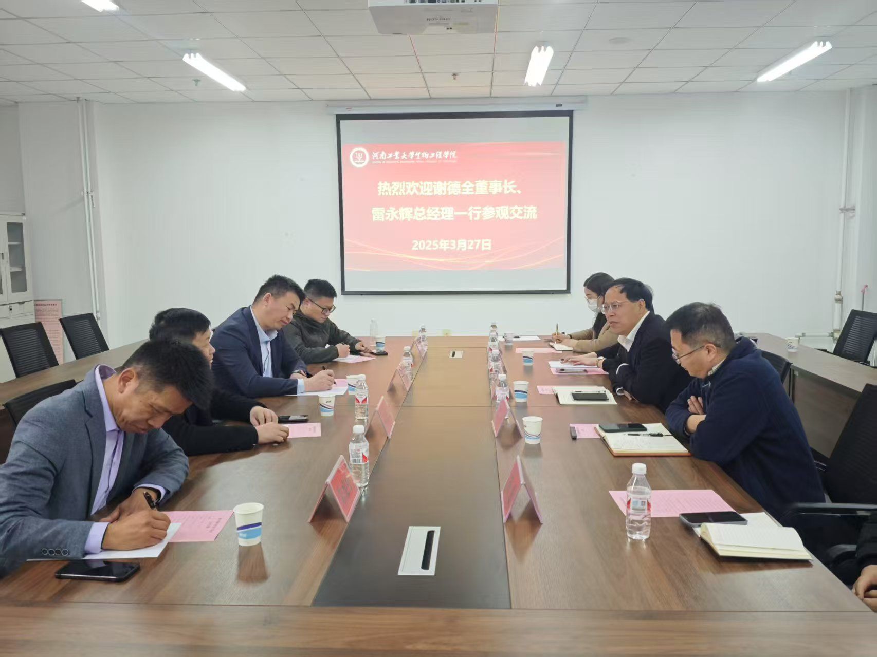 3月27日,重庆润森康泰科技有限公司董事长谢德全、河南思辨商业管理有限公司总经理雷永辉一行就液态发酵饲料技术开发来我院寻求交流合作。营养调控与饲料资源高效利用团队负责人张勇副教授、梁晓晓博士陪同参观发酵实训中心、酿酒发酵实验室、试验动物房、动科系实验室。随后,双方于惟德楼1314会议室召开座谈会。学院党委书记卫红伟、营养调控与饲料资源高效利用团队骨干成员程康、张雪蕾参加。会议由梁晓晓博士主持。