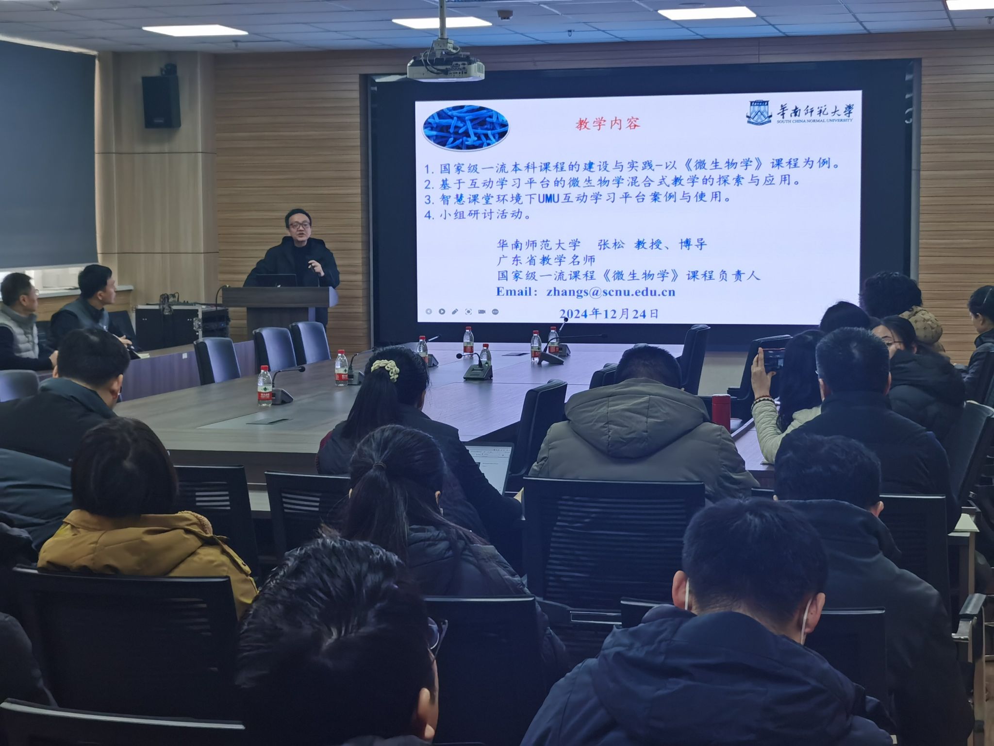 工作坊分两个阶段进行。上午,张松教授以“国家级一流本科课程的建设与实践”为题做专题报告,详细介绍了国家级一流本科课程《微生物学》的建设过程和设计理念,从微生物学多媒体教学软件研制到微生物学数字课程云平台使用,再到中国大学慕课第一批课程开课和国家级线上线下混合课程建设。重点阐述了现代信息技术及互动学习平台在教学过程和课程建设中的重要作用,并展示了基于知识图谱的《微生物学》AI课程建设最新成果。