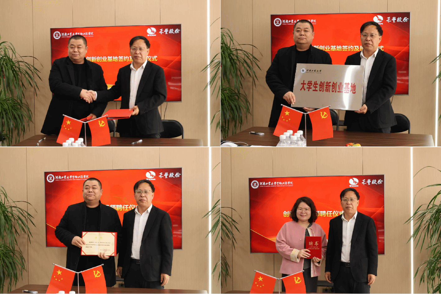 随后,在全体参会人员的见证下,学院与兰考禾丰正式签署了大学生创新创业基地协议,并为“大学生创新创业基地”授牌。卫红伟还向王志文、孙亚楠颁发了创新创业导师聘书。根据协议,校企双方将在大学生创新创业教育、科研实践等方面开展深化合作,赋能师生科技创新与成果转化。