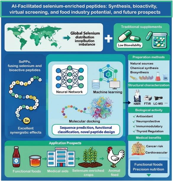 该论文题为“AI-Facilitated selenium-enriched peptides: Synthesis, bioactivity, virtual screening, and food industry potential, and future prospects”。聚焦“AI驱动功能性食品开发”这一明确的前沿方向,系统阐述了AI如何赋能富硒肽的设计、筛选与机制研究;论文不仅总结了现状,更指出了未来技术挑战与发展路径。该工作立足学科交叉热点,展现了学院在AI+生物这一新兴方向的积极布局与研究实力。