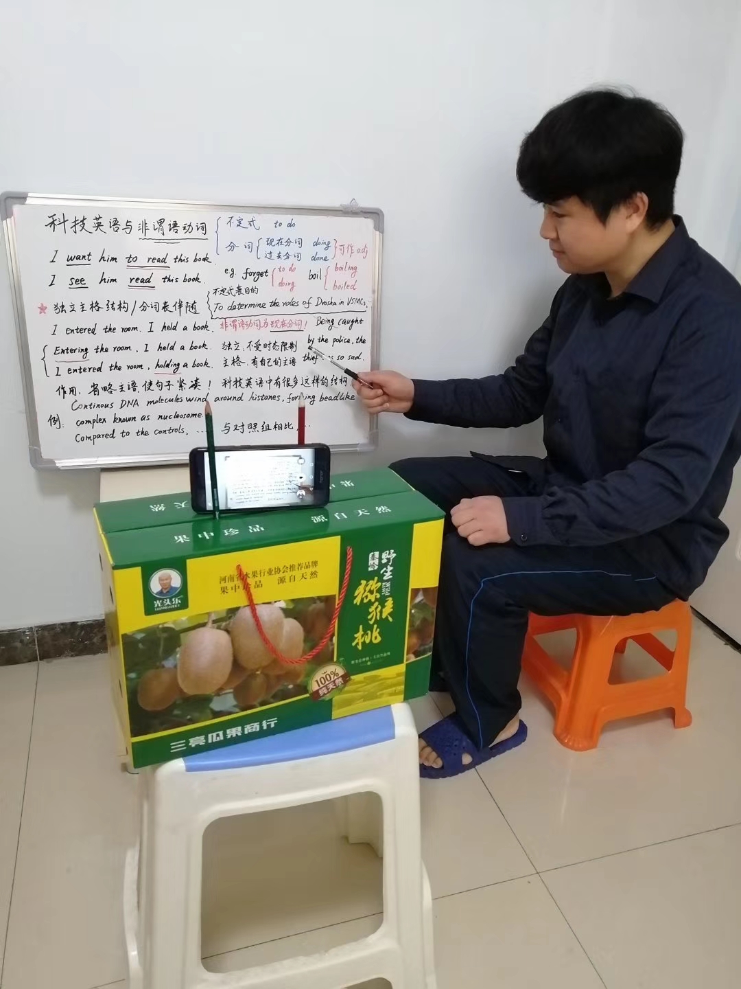 我院生物技术系范沛老师多措施并举,充分利用各种资源保障网上教学顺利进行,不断优化教学方式和教学效果。为了达到视觉效果最佳,首先要解决的是光线问题——视频要让学生能看的清楚,不能有阴影遮盖、不能留死角。于是范老师便经常性调整课程视频录制地点和角度,力争做到最优化处理。为了能够最大程度还原课堂教学情形,他自费购买教具,不计个人得失。考虑到多人同时在线造成的网络拥堵情况,他未雨绸缪,在学习群中提前将视频录制好并上传,方便同学们提前下载试看、预习,在上课过程中范老师时刻以学生为中心,及时为同学在线答疑解惑,保证学生上课过程顺畅、教学质量优质。