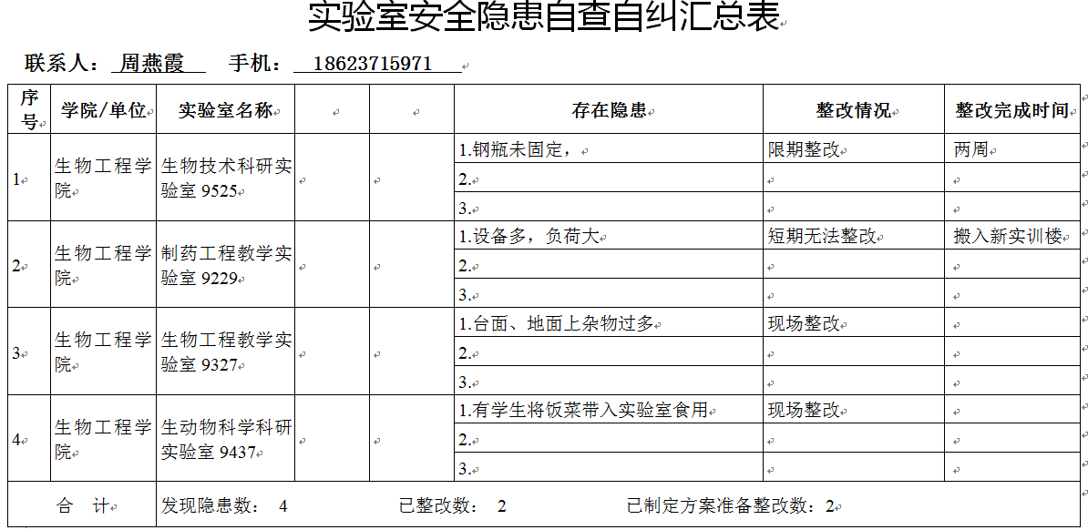 本次针对学院公共区域及暑期申请开放实验室的自查自纠排查,共查出四处隐患,详见附件2,其中现场整改两处,限期整改一处,短期无法整改一处,整改率达到百分之七十五。