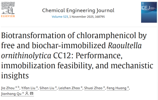 环境微生物与健康科技创新团队在环境工程领域的国际知名期刊《Chemical Engineering Journal》(中科院一区TOP,IF=13.2)上发表了题为“Biotransformation of chloramphenicol by free and biochar-immobilized Raoultella ornithinolytica CC12: performance, immobilization feasibility, and mechanistic insights”的研究论文。该团队周佳副教授为论文第一作者,屈建航教授为通讯作者,麻豆tv